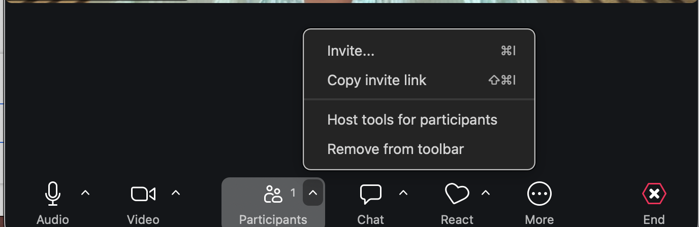 Another option to copy the link is to click on the "^" to the right of "Participants" icon at the bottom of the screen and Copy invite link.
