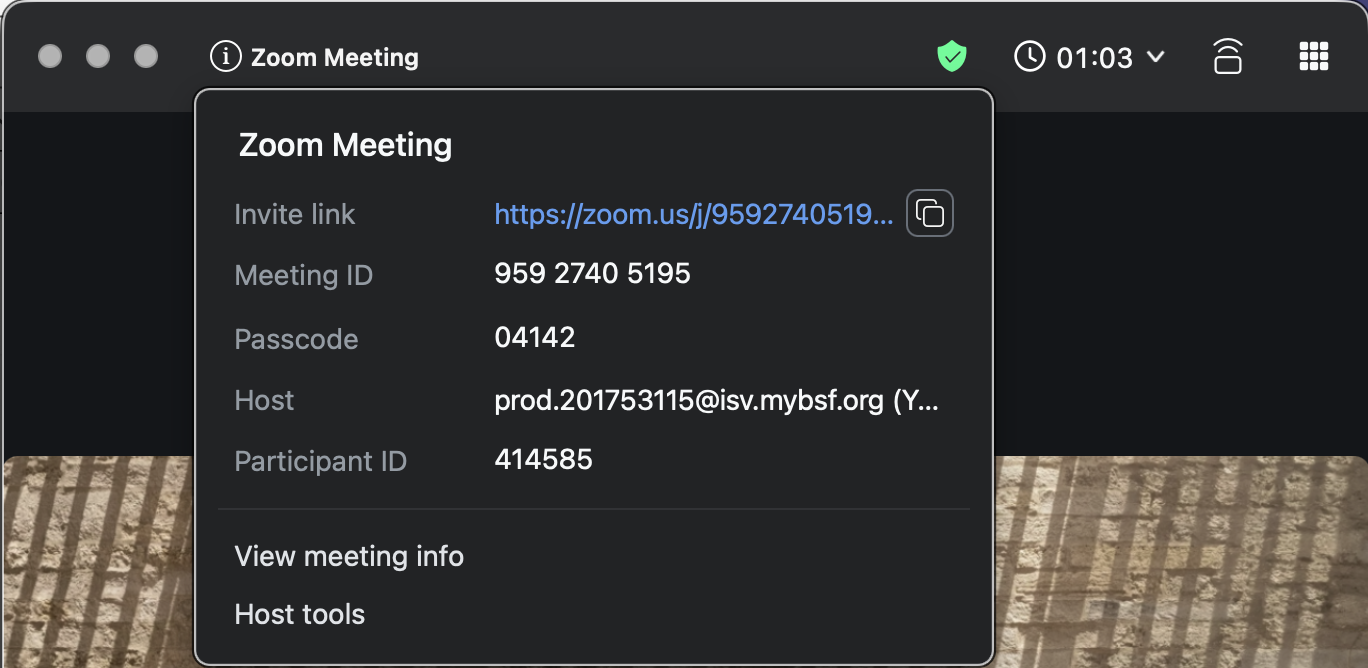 3. Zoom updated menu bar at the bottom and the invite link now on the top left corner under "i Zoom Meeting" (rather than the Green Shield icon on the top right):